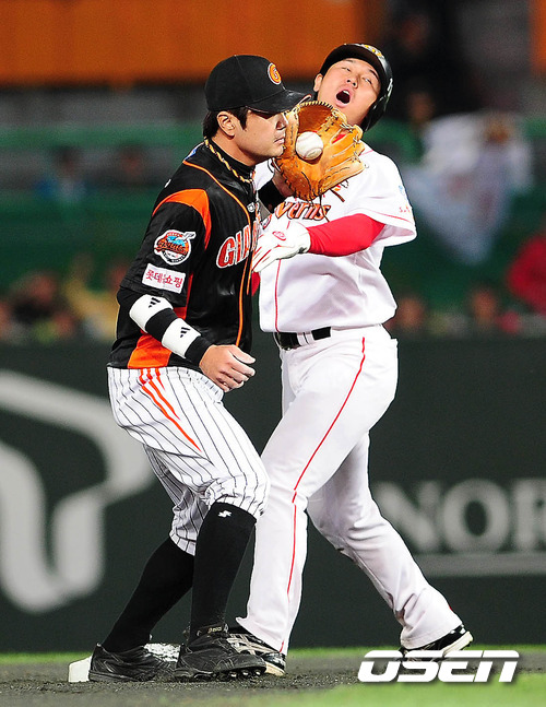 '2011 롯데카드 프로야구 플레이오프' 4차전 SK 와이번스와 롯데 자이언츠의 경기 1회말 2사 1루 도루 실패한 최정이 아쉬워 하고 있다. 20일 인천 문학구장에서 SK 와이번스와 롯데 자이언츠의 플레이오프 4차전 경기가 벌어졌다. 4차전 선발로 SK는 윤희상(26)을 롯데는 크리스 부첵(33)을 내세웠다. 플레이오프가 마감될 수 있는 4차전이라는 점에서 양 팀 모두 피할 수 없는 한판이다. 양팀은 1차전은 연장 접전 끝에 정상호의 홈런을 앞세운 SK가 ,2차전은 송승준의 역투와 전준우의 투런 홈런으로 롯데가 승리를, 3차전은 SK가 송은범의 호투를 바탕으로 승리를 거두어 시리즈 성적 2-1로 롯데를 벼랑 끝으로 밀어 넣었다. 한국시리즈 진출에 단 1승만을 남겨놓은 SK가 이대로 분위기를 이어갈지. 반면 탈락 위기에 놓인 롯데가 국면 전환을 할지 관심거리다. /spjj@osen.co.kr