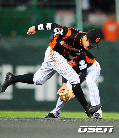 20일 오후 문학구장에서 열린 '2011 롯데카드 프로야구 플레이오프' 4차전 SK 와이번스와 롯데 자이언츠의 경기에서 1회말 2사 주자 없는 상황에서 SK 최정의 2루수 내야 안타를 롯데 유격수 문규현이 잡아내지 못하고 있다. 이번 4차전 선발로 SK는 윤희상(26)를 롯데는 크리스 부첵(33)을 내세웠다. 플레이오프가 마감될 수 있는 4차전이라는 점에서 양 팀 모두 피할 수 없는 한판이다. 양팀은 1차전서는 연장 접전 끝에 정상호의 홈런을 앞세운 SK가 2차전서는 송승준의 역투와 전준우의 투런 홈런으로 롯데가 승리를 거두어 사이좋게 1승씩을 나누어 가졌다. 그러나 SK는 3차전서 선발 송은범의 무실점 호투와 최동수의 결승타, 김강민의 2타점 쐐기타를 앞세워 승리를 거둬 한국시리즈에 1승만을 남겨둔 상태. 반면 탈락 위기에 놓인 롯데는 필승의지를 다지고 있다. / rumi@osen.co.kr