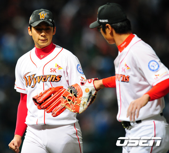 20일 오후 문학구장에서 열린 '2011 롯데카드 프로야구 플레이오프' 4차전 SK 와이번스와 롯데 자이언츠의 경기에서 3회 2사 주자 만루 위기를 무사히 넘긴 SK 선발 윤희상이 한숨을 내쉬며 덕아웃으로 들어오며 박정권과 하이파이브를 하고 있다. 이번 4차전 선발로 SK는 윤희상(26)를 롯데는 크리스 부첵(33)을 내세웠다. 플레이오프가 마감될 수 있는 4차전이라는 점에서 양 팀 모두 피할 수 없는 한판이다. 양팀은 1차전서는 연장 접전 끝에 정상호의 홈런을 앞세운 SK가 2차전서는 송승준의 역투와 전준우의 투런 홈런으로 롯데가 승리를 거두어 사이좋게 1승씩을 나누어 가졌다. 그러나 SK는 3차전서 선발 송은범의 무실점 호투와 최동수의 결승타, 김강민의 2타점 쐐기타를 앞세워 승리를 거둬 한국시리즈에 1승만을 남겨둔 상태. 반면 탈락 위기에 놓인 롯데는 필승의지를 다지고 있다. / rumi@osen.co.kr