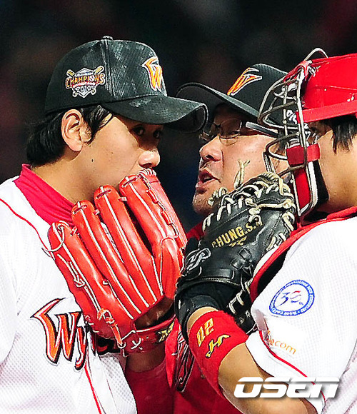 '2011 롯데카드 프로야구 플레이오프' 4차전 SK 와이번스와 롯데 자이언츠의 경기 3회초 2사 만루 김상진 코치가 마운드에 올라 윤희상 투수를 진정시키고 있다. 20일 인천 문학구장에서 SK 와이번스와 롯데 자이언츠의 플레이오프 4차전 경기가 벌어졌다. 4차전 선발로 SK는 윤희상(26)을 롯데는 크리스 부첵(33)을 내세웠다. 플레이오프가 마감될 수 있는 4차전이라는 점에서 양 팀 모두 피할 수 없는 한판이다. 양팀은 1차전은 연장 접전 끝에 정상호의 홈런을 앞세운 SK가 ,2차전은 송승준의 역투와 전준우의 투런 홈런으로 롯데가 승리를, 3차전은 SK가 송은범의 호투를 바탕으로 승리를 거두어 시리즈 성적 2-1로 롯데를 벼랑 끝으로 밀어 넣었다. 한국시리즈 진출에 단 1승만을 남겨놓은 SK가 이대로 분위기를 이어갈지. 반면 탈락 위기에 놓인 롯데가 국면 전환을 할지 관심거리다. /spjj@osen.co.kr