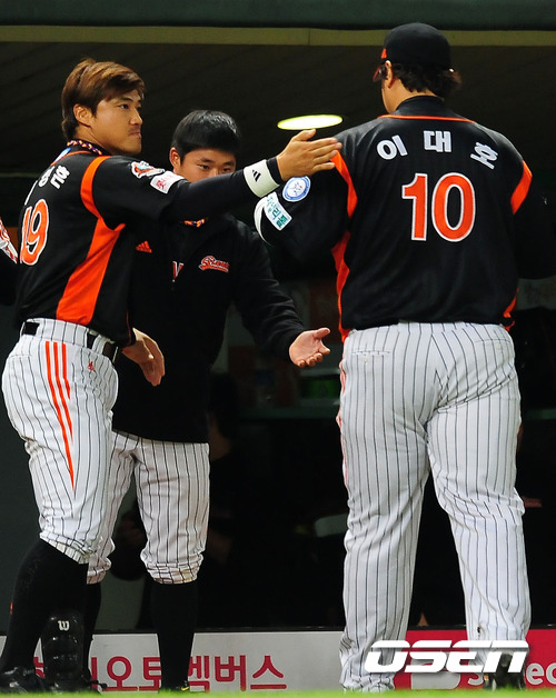 20일 오후 문학구장에서 열린 '2011 롯데카드 프로야구 플레이오프' 4차전 SK 와이번스와 롯데 자이언츠의 경기에서 롯데가 3회말을 병살처리로 막아낸 후 덕아웃에서 홍성흔과 이대호가 하이파이브를 하고 있다. 이번 4차전 선발로 SK는 윤희상(26)를 롯데는 크리스 부첵(33)을 내세웠다. 플레이오프가 마감될 수 있는 4차전이라는 점에서 양 팀 모두 피할 수 없는 한판이다. 양팀은 1차전서는 연장 접전 끝에 정상호의 홈런을 앞세운 SK가 2차전서는 송승준의 역투와 전준우의 투런 홈런으로 롯데가 승리를 거두어 사이좋게 1승씩을 나누어 가졌다. 그러나 SK는 3차전서 선발 송은범의 무실점 호투와 최동수의 결승타, 김강민의 2타점 쐐기타를 앞세워 승리를 거둬 한국시리즈에 1승만을 남겨둔 상태. 반면 탈락 위기에 놓인 롯데는 필승의지를 다지고 있다. / rumi@osen.co.kr