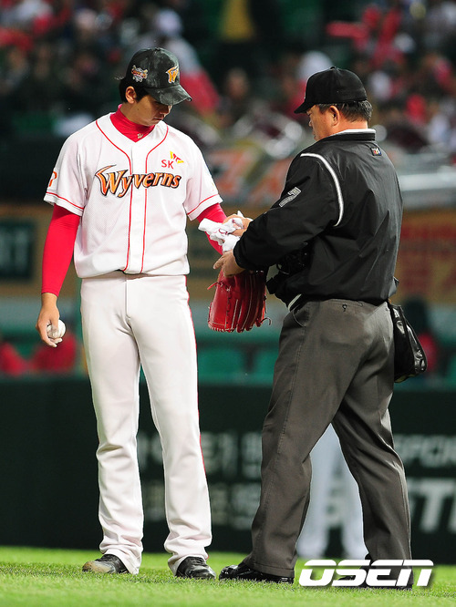 '2011 롯데카드 프로야구 플레이오프' 4차전 SK 와이번스와 롯데 자이언츠의 경기 4회초 1사 문승훈 구심이 윤희상 투수의 팔에 묻어있는 로진을 털어주고 있다. 20일 인천 문학구장에서 SK 와이번스와 롯데 자이언츠의 플레이오프 4차전 경기가 벌어졌다. 4차전 선발로 SK는 윤희상(26)을 롯데는 크리스 부첵(33)을 내세웠다. 플레이오프가 마감될 수 있는 4차전이라는 점에서 양 팀 모두 피할 수 없는 한판이다. 양팀은 1차전은 연장 접전 끝에 정상호의 홈런을 앞세운 SK가 ,2차전은 송승준의 역투와 전준우의 투런 홈런으로 롯데가 승리를, 3차전은 SK가 송은범의 호투를 바탕으로 승리를 거두어 시리즈 성적 2-1로 롯데를 벼랑 끝으로 밀어 넣었다. 한국시리즈 진출에 단 1승만을 남겨놓은 SK가 이대로 분위기를 이어갈지. 반면 탈락 위기에 놓인 롯데가 국면 전환을 할지 관심거리다. /spjj@osen.co.kr