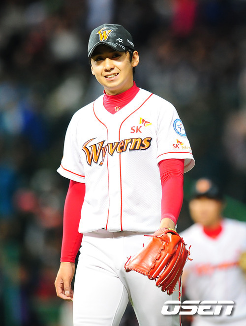 20일 오후 문학구장에서 열린 '2011 롯데카드 프로야구 플레이오프' 4차전 SK 와이번스와 롯데 자이언츠의 경기에서 4회를 무사히 마무리한 SK 선발 윤희상이 미소짓고 있다. 이번 4차전 선발로 SK는 윤희상(26)를 롯데는 크리스 부첵(33)을 내세웠다. 플레이오프가 마감될 수 있는 4차전이라는 점에서 양 팀 모두 피할 수 없는 한판이다. 양팀은 1차전서는 연장 접전 끝에 정상호의 홈런을 앞세운 SK가 2차전서는 송승준의 역투와 전준우의 투런 홈런으로 롯데가 승리를 거두어 사이좋게 1승씩을 나누어 가졌다. 그러나 SK는 3차전서 선발 송은범의 무실점 호투와 최동수의 결승타, 김강민의 2타점 쐐기타를 앞세워 승리를 거둬 한국시리즈에 1승만을 남겨둔 상태. 반면 탈락 위기에 놓인 롯데는 필승의지를 다지고 있다. / rumi@osen.co.kr