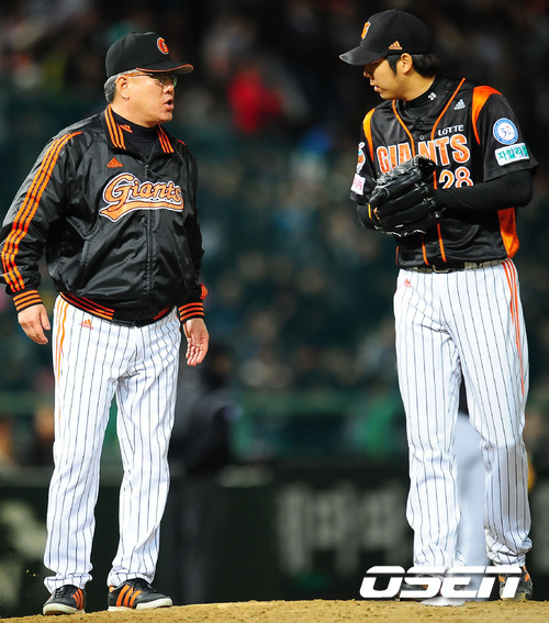 20일 오후 문학구장에서 열린 '2011 롯데카드 프로야구 플레이오프' 4차전 SK 와이번스와 롯데 자이언츠의 경기에서 4회말 1사 주자 1루 롯데 선발 부첵 대신 마운드에 오른 장원준이 롯데 양승호 감독의 지시를 듣고 있다. 이번 4차전 선발로 SK는 윤희상(26)를 롯데는 크리스 부첵(33)을 내세웠다. 플레이오프가 마감될 수 있는 4차전이라는 점에서 양 팀 모두 피할 수 없는 한판이다. 양팀은 1차전서는 연장 접전 끝에 정상호의 홈런을 앞세운 SK가 2차전서는 송승준의 역투와 전준우의 투런 홈런으로 롯데가 승리를 거두어 사이좋게 1승씩을 나누어 가졌다. 그러나 SK는 3차전서 선발 송은범의 무실점 호투와 최동수의 결승타, 김강민의 2타점 쐐기타를 앞세워 승리를 거둬 한국시리즈에 1승만을 남겨둔 상태. 반면 탈락 위기에 놓인 롯데는 필승의지를 다지고 있다. / rumi@osen.co.kr
