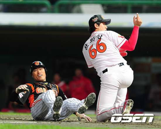 '2011 롯데카드 프로야구 플레이오프' 4차전 SK 와이번스와 롯데 자이언츠의 경기 5회초 1사 2루 김주찬의 중전 안타때 김주찬이 2루로 달려 송구가 2루로 가자 조성환이 홈을 파고들었지만 아웃 되고 있다. 20일 인천 문학구장에서 SK 와이번스와 롯데 자이언츠의 플레이오프 4차전 경기가 벌어졌다. 4차전 선발로 SK는 윤희상(26)을 롯데는 크리스 부첵(33)을 내세웠다. 플레이오프가 마감될 수 있는 4차전이라는 점에서 양 팀 모두 피할 수 없는 한판이다. 양팀은 1차전은 연장 접전 끝에 정상호의 홈런을 앞세운 SK가 ,2차전은 송승준의 역투와 전준우의 투런 홈런으로 롯데가 승리를, 3차전은 SK가 송은범의 호투를 바탕으로 승리를 거두어 시리즈 성적 2-1로 롯데를 벼랑 끝으로 밀어 넣었다. 한국시리즈 진출에 단 1승만을 남겨놓은 SK가 이대로 분위기를 이어갈지. 반면 탈락 위기에 놓인 롯데가 국면 전환을 할지 관심거리다. /spjj@osen.co.kr