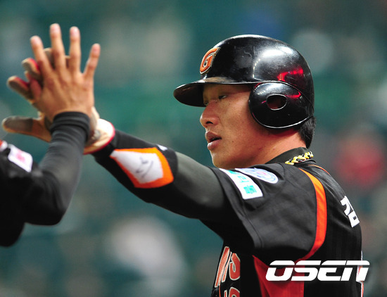 '2011 롯데카드 프로야구 플레이오프' 4차전 SK 와이번스와 롯데 자이언츠의 경기 5회초 2사 2루 김주찬이 손아섭의 안타때 홈을 밟고 동료들의 환영을 받고 있다. 20일 인천 문학구장에서 SK 와이번스와 롯데 자이언츠의 플레이오프 4차전 경기가 벌어졌다. 4차전 선발로 SK는 윤희상(26)을 롯데는 크리스 부첵(33)을 내세웠다. 플레이오프가 마감될 수 있는 4차전이라는 점에서 양 팀 모두 피할 수 없는 한판이다. 양팀은 1차전은 연장 접전 끝에 정상호의 홈런을 앞세운 SK가 ,2차전은 송승준의 역투와 전준우의 투런 홈런으로 롯데가 승리를, 3차전은 SK가 송은범의 호투를 바탕으로 승리를 거두어 시리즈 성적 2-1로 롯데를 벼랑 끝으로 밀어 넣었다. 한국시리즈 진출에 단 1승만을 남겨놓은 SK가 이대로 분위기를 이어갈지. 반면 탈락 위기에 놓인 롯데가 국면 전환을 할지 관심거리다. /spjj@osen.co.kr