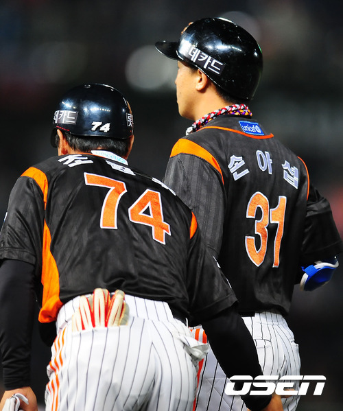 20일 오후 문학구장에서 열린 '2011 롯데카드 프로야구 플레이오프' 4차전 SK 와이번스와 롯데 자이언츠의 경기에서 5회초 2사 주자 2루 롯데 손아섭이 좌익수 앞 선취 1타점 적시타를 날린 후 조원우 코치의 축하를 받고 있다. 이번 4차전 선발로 SK는 윤희상(26)를 롯데는 크리스 부첵(33)을 내세웠다. 플레이오프가 마감될 수 있는 4차전이라는 점에서 양 팀 모두 피할 수 없는 한판이다. 양팀은 1차전서는 연장 접전 끝에 정상호의 홈런을 앞세운 SK가 2차전서는 송승준의 역투와 전준우의 투런 홈런으로 롯데가 승리를 거두어 사이좋게 1승씩을 나누어 가졌다. 그러나 SK는 3차전서 선발 송은범의 무실점 호투와 최동수의 결승타, 김강민의 2타점 쐐기타를 앞세워 승리를 거둬 한국시리즈에 1승만을 남겨둔 상태. 반면 탈락 위기에 놓인 롯데는 필승의지를 다지고 있다. / rumi@osen.co.kr
