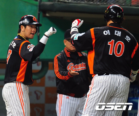 20일 오후 문학구장에서 열린 '2011 롯데카드 프로야구 플레이오프' 4차전 SK 와이번스와 롯데 자이언츠의 경기에서 6회초 첫타석에서 롯데 이대호가 좌중월 솔로 홈런을 날린 후 덕아웃 앞에서 강민호와 하이파이브를 하고 있다. 이번 4차전 선발로 SK는 윤희상(26)를 롯데는 크리스 부첵(33)을 내세웠다. 플레이오프가 마감될 수 있는 4차전이라는 점에서 양 팀 모두 피할 수 없는 한판이다. 양팀은 1차전서는 연장 접전 끝에 정상호의 홈런을 앞세운 SK가 2차전서는 송승준의 역투와 전준우의 투런 홈런으로 롯데가 승리를 거두어 사이좋게 1승씩을 나누어 가졌다. 그러나 SK는 3차전서 선발 송은범의 무실점 호투와 최동수의 결승타, 김강민의 2타점 쐐기타를 앞세워 승리를 거둬 한국시리즈에 1승만을 남겨둔 상태. 반면 탈락 위기에 놓인 롯데는 필승의지를 다지고 있다. / rumi@osen.co.kr