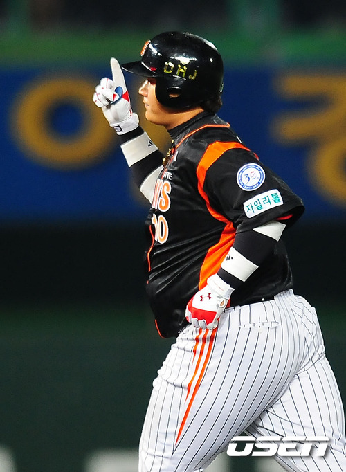 20일 오후 문학구장에서 열린 '2011 롯데카드 프로야구 플레이오프' 4차전 SK 와이번스와 롯데 자이언츠의 경기에서 6회초 첫타석에서 롯데 이대호가 좌중월 솔로 홈런을 날린 후 손가락을 치켜들고 있다. 이번 4차전 선발로 SK는 윤희상(26)를 롯데는 크리스 부첵(33)을 내세웠다. 플레이오프가 마감될 수 있는 4차전이라는 점에서 양 팀 모두 피할 수 없는 한판이다. 양팀은 1차전서는 연장 접전 끝에 정상호의 홈런을 앞세운 SK가 2차전서는 송승준의 역투와 전준우의 투런 홈런으로 롯데가 승리를 거두어 사이좋게 1승씩을 나누어 가졌다. 그러나 SK는 3차전서 선발 송은범의 무실점 호투와 최동수의 결승타, 김강민의 2타점 쐐기타를 앞세워 승리를 거둬 한국시리즈에 1승만을 남겨둔 상태. 반면 탈락 위기에 놓인 롯데는 필승의지를 다지고 있다. / rumi@osen.co.kr