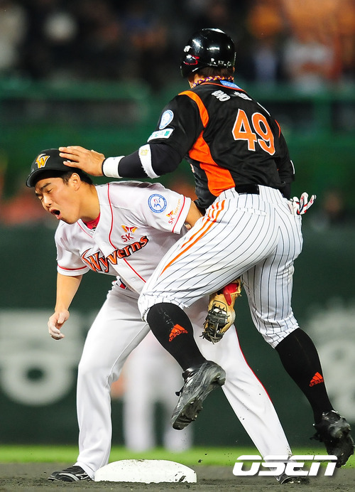20일 오후 문학구장에서 열린 '2011 롯데카드 프로야구 플레이오프' 4차전 SK 와이번스와 롯데 자이언츠의 경기에서 6회초 1사 주자 1루 롯데 황재균 타석에서 1루 주자 홍성흔이 2루 도루를 시도, 2루수 정근우에게 태그아웃 당하고 있다. 이번 4차전 선발로 SK는 윤희상(26)를 롯데는 크리스 부첵(33)을 내세웠다. 플레이오프가 마감될 수 있는 4차전이라는 점에서 양 팀 모두 피할 수 없는 한판이다. 양팀은 1차전서는 연장 접전 끝에 정상호의 홈런을 앞세운 SK가 2차전서는 송승준의 역투와 전준우의 투런 홈런으로 롯데가 승리를 거두어 사이좋게 1승씩을 나누어 가졌다. 그러나 SK는 3차전서 선발 송은범의 무실점 호투와 최동수의 결승타, 김강민의 2타점 쐐기타를 앞세워 승리를 거둬 한국시리즈에 1승만을 남겨둔 상태. 반면 탈락 위기에 놓인 롯데는 필승의지를 다지고 있다. / rumi@osen.co.kr