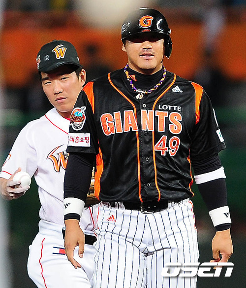 '2011 롯데카드 프로야구 플레이오프' 4차전 SK 와이번스와 롯데 자이언츠의 경기 6회초 1사 홍성흔이 도루에 실패하고 덕아웃으로 가고 있다. 20일 인천 문학구장에서 SK 와이번스와 롯데 자이언츠의 플레이오프 4차전 경기가 벌어졌다. 4차전 선발로 SK는 윤희상(26)을 롯데는 크리스 부첵(33)을 내세웠다. 플레이오프가 마감될 수 있는 4차전이라는 점에서 양 팀 모두 피할 수 없는 한판이다. 양팀은 1차전은 연장 접전 끝에 정상호의 홈런을 앞세운 SK가 ,2차전은 송승준의 역투와 전준우의 투런 홈런으로 롯데가 승리를, 3차전은 SK가 송은범의 호투를 바탕으로 승리를 거두어 시리즈 성적 2-1로 롯데를 벼랑 끝으로 밀어 넣었다. 한국시리즈 진출에 단 1승만을 남겨놓은 SK가 이대로 분위기를 이어갈지. 반면 탈락 위기에 놓인 롯데가 국면 전환을 할지 관심거리다. /spjj@osen.co.kr