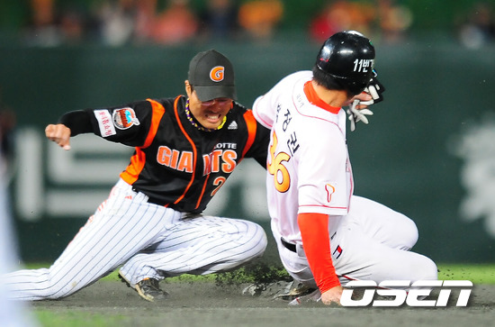 20일 오후 문학구장에서 열린 '2011 롯데카드 프로야구 플레이오프' 4차전 SK 와이번스와 롯데 자이언츠의 경기에서 7회말 1사 주자 1루 SK 안치용의 삼진아웃때 1루 주자 박정권이 2루 도루를 시도, 롯데 2루수 조성환에게 태그아웃을 당하고 있다. 이번 4차전 선발로 SK는 윤희상(26)를 롯데는 크리스 부첵(33)을 내세웠다. 플레이오프가 마감될 수 있는 4차전이라는 점에서 양 팀 모두 피할 수 없는 한판이다. 양팀은 1차전서는 연장 접전 끝에 정상호의 홈런을 앞세운 SK가 2차전서는 송승준의 역투와 전준우의 투런 홈런으로 롯데가 승리를 거두어 사이좋게 1승씩을 나누어 가졌다. 그러나 SK는 3차전서 선발 송은범의 무실점 호투와 최동수의 결승타, 김강민의 2타점 쐐기타를 앞세워 승리를 거둬 한국시리즈에 1승만을 남겨둔 상태. 반면 탈락 위기에 놓인 롯데는 필승의지를 다지고 있다. / rumi@osen.co.kr