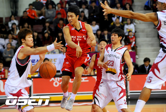 로드니 화이트가 38점을 폭발시키며 안양 KGC인삼공사를 2연승으로 이끌었다. 이상범 감독이 지휘하는 안양 KGC인삼공사는 20일 안양 실내체육관서 열린 창원 LG와 '2011-2012 KB국민카드 프로농구' 1라운드 홈 경기서 로드니 화이트(38점)의 대활약에 힘입어 81-71로 승리를 거뒀다. 이로써 KGC는 개막 후 2연패 뒤 2연승을 달리며 분위기를 반전시키는 데 성공했다. 반면 LG는 개막 후 2연승의 좋은 상승세가 KGC에 의해 한풀 꺾이고 말았다. 4쿼터 KGC 김태술이 골밑에서 패스를 하고 있다. / soul1014@osen.co.kr