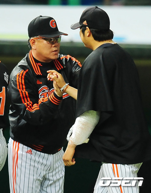 20일 오후 문학구장에서 열린 '2011 롯데카드 프로야구 플레이오프' 4차전 SK 와이번스와 롯데 자이언츠의 경기에서 롯데 자이언츠가 이대호의 홈런을 앞세워 2-0 승리를 거두었다. 경기를 마치고 롯데 양승호 감독이 장원준과 하이파이브를 하고 있다. 이번 4차전 선발로 SK는 윤희상(26)을 롯데는 크리스 부첵(33)을 내세웠다. 플레이오프가 마감될 수 있는 4차전이라는 점에서 양 팀 모두 피할 수 없는 한판이었다. 그러나 승리의 여신은 롯데의 손을 들어주었다.이대호는 SK와의 플레이오프 4차전서 1-0으로 간신히 앞선 6회초 선두타자로 나서 이영욱의 3구 째를 제대로 당겨쳤다. 이는 좌중간 담장을 넘는 솔로포로 이어졌다.선수 개인의 첫 플레이오프 홈런포다. 시리즈 전적 2승2패로 삼성과의 한국시리즈 맞대결 팀은 결국 22일 부산 사직구장서 벌어지는 5차전에서 결판나게 되었다. / rumi@osen.co.kr