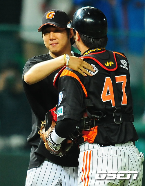 20일 오후 문학구장에서 열린 '2011 롯데카드 프로야구 플레이오프' 4차전 SK 와이번스와 롯데 자이언츠의 경기에서 롯데 자이언츠가 이대호의 홈런을 앞세워 2-0 승리를 거두었다. 경기를 마치고 롯데 장원준과 강민호가 포옹을 하고 있다.. 이번 4차전 선발로 SK는 윤희상(26)을 롯데는 크리스 부첵(33)을 내세웠다. 플레이오프가 마감될 수 있는 4차전이라는 점에서 양 팀 모두 피할 수 없는 한판이었다. 그러나 승리의 여신은 롯데의 손을 들어주었다.이대호는 SK와의 플레이오프 4차전서 1-0으로 간신히 앞선 6회초 선두타자로 나서 이영욱의 3구 째를 제대로 당겨쳤다. 이는 좌중간 담장을 넘는 솔로포로 이어졌다.선수 개인의 첫 플레이오프 홈런포다. 시리즈 전적 2승2패로 삼성과의 한국시리즈 맞대결 팀은 결국 22일 부산 사직구장서 벌어지는 5차전에서 결판나게 되었다. / rumi@osen.co.kr