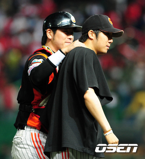 '2011 롯데카드 프로야구' 플레이오프 4차전서 승리를 거둔 롯데 강민호와 장원준이 승리의 기쁨을 나누고 있다. 기사회생이다. 벼랑 끝에 몰렸던 롯데 자이언츠가 승부를 다시 원점으로 돌렸다. 기다렸던 이대호의 홈런포가 작렬, 더욱 값진 승리를 안았다. 롯데는 20일 문학구장에서 열린 롯데와의 플레이오프 4차전에서 선발 부첵과 장원준의 호투, 손아섭의 결승타와 이대호의 쐐기포를 앞세워 2-0으로 이겼다. 선발 부첵은 3⅓이닝 동안 2피안타 2탈삼진 2피안타 무실점으로 호투를 펼쳤다. 총 투구수는 44개. 146km를 최고 구속으로 찍었다. 롯데 양승호 감독은 무실점으로 잘 던지던 부첵을 내리고 대신 1차전 선발 장원준을 마운드에 올리는 승부수를 띄웠다. 장원준은 4이닝 1피안타 1볼넷 5탈삼진으로 무실점, 역시 무실점하며 구원승을 따냈다. 총투구수는 52개. 1차전 9회말 병살타를 쳐 고개를 숙였던 손아섭은 이날 5회 선제 적시타로 팀 승리를 이끌었다. 특히 4번 타자 이대호는 6회 선두타자로 나와 좌중월 솔로포를 쏘아올렸다. 선발 윤희상 대신 마운드에 오른 이영욱이 볼카운트 1-1에서 던진 3구째 커브(107km)가 힘없이 바깥쪽으로 높게 걸치며 들어오자 여지없이 스윙을 돌렸다. 이번 포스트시즌 첫 홈런포. 이날 승부를 결정지은 쐐기포이기도 했다. 이로써 SK와의 2승2패 균형을 이룬 롯데는 오는 22일 부산 사직구장에서 열리는 플레이오프 5차전 홈경기에서 한국시리즈 진출 티켓을 둔 피할 수 없는 한판 경기를 치른다. /spjj@osen.co.kr