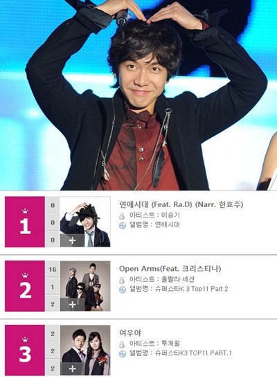 가수 이승기가 미국 빌보드 K팝 차트 1위를 차지했다. 21일 빌보드 K-팝 최신 차트에 따르면 이승기의 곡 '연애시대'가 1위에 올랐다. 이승기가 지난 14일 발매한 '연애시대'는 20대 솔로의 감정을 솔직하게 담아낸 노래이며 배우 한효주의 나레이션이 눈길을 끄는 곡이다. 이승기의 뒤를 이어 2위에는 엠넷 '슈퍼스타K3'에 출연 중인 울랄라세션의 곡 '오픈 암스', 3위 투개월의 '여우야'가 이름을 올렸다. 한편 이번주 톱 10에 새롭게 진입한 곡으로는 6위를 차지한 타블로의 '에어백', 7위 오렌지캬라멜의 '샹하이 로맨스', 8위 투개월의 '포커 페이스', 10위 김경호의 '사랑과 우정 사이'가 있다. goodhmh@osen.co.kr 빌보드 K팝 차트 캡처.