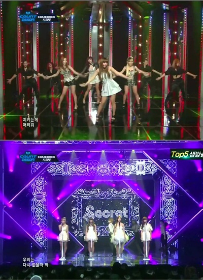 걸그룹 시크릿이 섹시한 변신을 시도하며 첫 정규앨범 타이틀 곡 '사랑은 무브'의 화려한 컴백 무대를 가졌다. 시크릿은 지난 20일 방송된 엠넷 '엠카운트다운'에서 '사랑은 무브'와 발라드 곡 '웃지좀 마'를 선보이며 화려한 컴백 신고식을 치렀다. 시크릿은 먼저 선보인 '웃지좀 마' 무대서 미니 웨딩 드레스를 입고 감미로운 발라드를 불렀다. 특히 징거의 수준급 랩 실력이 보는 이를 감탄케 했다. 이어진 '사랑은 무브'에서는 멤버들이 짧은 미니스커트를 입고 나와 하의실종 패션을 선보였다. '쪼아춤', '엄마고릴라춤','폴더춤' 등 포인트 안무도 눈에 띄었다. 기존의 귀여운 안무와는 다른 파워풀한 동작이 시선을 사로잡았다. 최근 감기 몸살로 링거 투혼을 감행한 효성은 이날 보라색의 웨이브진 헤어와 특유의 눈웃음을 보이며 완벽한 무대를 꾸몄다. 이에 팬들은 "다행이다"라는 반응을 보이며 안심하기도 했다. 네티즌들은 “시크릿의 새로운 모습 좋다”, “사랑은 무~브~, 나도 모르게 따라하고 있음“, "효성이의 통통춤 귀엽다” 등의 반응을 보였다. goodhmh@osen.co.kr 엠넷 '엠카운트다운' 캡처