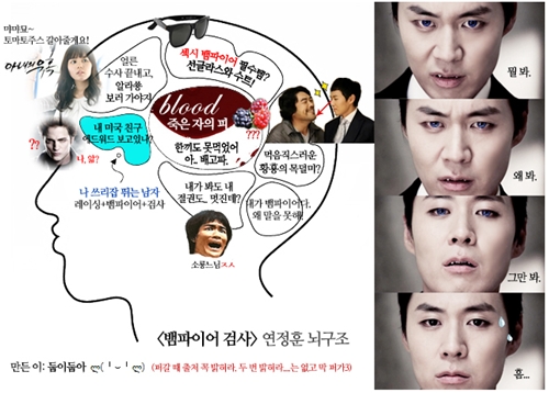 ‘뱀파이어 검사’를 통해 카리스마 뱀파이어로 변신하며 여심을 사로잡고 있는 배우 연정훈의 뇌구조가 네티즌들 사이에서 인기다. 블로그 및 소설 네트워킹 서비스 등에 ‘연정훈 뇌구조’ 이미지가 전해지면서 네티즌들의 관심이 집중되고 있다. 최근 화제를 모으고 있는 이른바 ‘연정훈의 뇌구조’에는 그가 관심 있어 할 만 한 다양한 소재들이 구성돼 있다. 특히 OCN에서 방영 중인 ‘뱀파이어 검사’와 관계된 요소가 많아 눈길을 끈다. 그 중 ‘한 끼도 못 먹었어. 아 배고파’라는 문구는 폭소를 자아낸다. 연정훈이 맡은 민태연 검사 역은 어느 날 갑자기 뱀파이어에게 물린 후, 뱀파이어의 욕망을 억누르고 각종 강력 사건을 해결해 나가는 독특한 캐릭터다. 산 자의 피를 취하는 기존의 뱀파이어와는 달리, 죽은 자의 피로만 연명하며 사회악을 위해 싸우는 정의로운 검사. 하지만 황순범 형사(이원종)의 목덜미를 보며 ‘먹음직스럽다’라는 속마음을 드러내 깨알 재미를 선사하고 있다. 더불어 ‘나는 쓰리잡 뛰는 남자’는 최근 XTM ‘탑 기어 코리아’에서 MC로 종횡무진 활약하며 새로운 이미지를 선보이고 있는 연정훈의 활약을 잘 드러내고 있다. ‘뱀파이어’의 능력으로 범인을 잡는 만큼 ‘뱀파이어’도 직업군으로 인식한 연정훈의 투철한 프로정신 또한 돋보인다. 뿐만 아니라 섹시 카리스마로 요즘 부쩍 여성 팬들이 늘어난 연정훈의 자신감 넘치는 모습도 엿볼 수 있다. 연정훈은 섹시 뱀파이어 필수 아이템인 ‘블랙 선글라스와 수트’로 최고의 간지 뱀파이어에 등극하며 네티즌들의 인기를 얻고 있다. 이를 본 네티즌들은 “뱀파이어 뇌구조 보고 빵 터졌다. 최고의 능력을 가진 뱀파이어도 말 못할 고민이 많은 것 같다”, “뱀파이어 검사를 보고 연정훈의 팬이 됐다”, “연정훈처럼 주변에 친한 뱀파이어가 있었으면 좋겠다” 등 응원의 메시지를 보내고 있다. 한편 ‘뱀파이어 검사’는 어느 날 갑자기 뱀파이어가 되어 버린 기막힌 운명의 대한민국 검사(연정훈)가 자신의 정체를 숨긴 채 뱀파이어의 특별한 능력을 이용해 각종 사회악을 해결해 나가는 뱀파이어 소재의 범죄 수사 드라마. 다이내믹한 영상과 긴장감 넘치는 스토리, 시원시원한 액션으로 첫 방송부터 3주 연속 동시간대 시청률 1위에 오르며 호평 받고 있다. 매주 일요일 밤 11시 방송된다. rosecut@osen.co.kr [사진] OCN 제공.