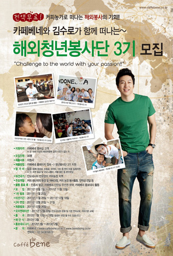 카페베네 해외청년봉사단이 ‘기회가 되면 꼭 한 번 해보고 싶은 대외활동’ BEST 3위로 선정됐다. 취업포털 잡코리아와 대학생 매거진 잡앤조이가 지난 9월, 20대 225명을 상대로 설문조사한 '대학생 기업 체험 활동 베스트30'에서 이같이 나타났다. 상위 30위 안에 든 기업들의 대외활동을 분석해 보면 해외봉사 체험과 마케팅 관련 분야가 높은 관심을 받았다. 특히 카페베네의 해외청년봉사단은 각종 캠퍼스 마케팅 프로모션과 SNS, PR활동 등과 더불어 대학생들로부터 좋은 반응을 얻은 것으로 조사됐다. ‘꼭 한번 활동해보고 싶은 대외활동’ 사항의 상위 10개 대외활동으로는 해외탐방 프로그램과 마케팅 관련 프로그램이 있었다. 카페베네의 경우 해외봉사단 활동과 더불어 다양한 마케팅 프로그램을 주도하고 있어 젊은 세대가 호응하는 마케팅을 성공적으로 운영한 기업으로 꼽히고 있기도 하다. 카페베네 해외청년봉사단은 2009년 1기를 시작으로 올해도 3기를 모집 중에 있다. 이번 해외청년봉사단에는 배우 김수로 씨도 함께할 예정으로 커피생산국인 ‘인도네시아’ 의 반유앙이에서 ‘커피 농장 체험’ 이라는 큰 테마 아래 현지인들의 삶을 직접 경험하고 나눔과 봉사의 의미를 되새길 수 있는 기회를 제공하고 있다. 해외여행에 결격사유가 없는 카페베네 멤버십 회원이라면 누구나 지원 가능하며, 오는 11월 15일까지 신청서를 제출하면 된다. 한편 오는 12월 뉴욕 맨해튼-해외1호점 개장을 앞둔 ‘글로벌브랜드-카페베네’는 온라인(caffebene.co.kr)과 트위터(@caffebenehq)를 통해 더 가까이 만날 수 있다. silver11@osen.co.kr