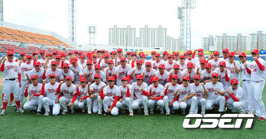 [OSEN=광주 ,백승철 인턴기자] 21일 오후 광주구장에서 열린 선동렬 신인감독과 KIA 선수단의 상견례 자리에서 선동렬 감독과 선수단이 기념촬영을 하고 있다. KIA는 지난 18일 조범현 감독 사퇴와 함께 선동렬 전 삼성 감독의 선임을 발표했다. 선동렬 신임감독은 광주 출신으로 해태에서 11년간 6차례 한국시리즈 우승을 이끌었으며, 그와 함께 이순철 전 LG 감독이 수석코치로 내정돼 지역색이 많이 부각되고 있다는 시선이다. KIA 7대 사령탑인 성동렬 신인감독은 불펜야구 강화론을 내세우며 삼성식 야구가 아닌 KIA의 팀컬러에 맞는 운용을 하겠다는 의지를 밝혔다. / baik@osen.co.kr
