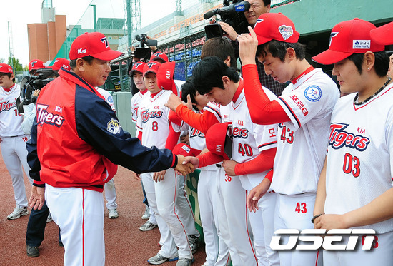 [OSEN=광주 ,백승철 인턴기자] 21일 오후 광주구장에서 열린 선동렬 신인감독과 KIA 선수단의 상견례 자리에서 선동렬 감독이 선수들과 악수를 나누고 있다. KIA는 지난 18일 조범현 감독 사퇴와 함께 선동렬 전 삼성 감독의 선임을 발표했다. 선동렬 신임감독은 광주 출신으로 해태에서 11년간 6차례 한국시리즈 우승을 이끌었으며, 그와 함께 이순철 전 LG 감독이 수석코치로 내정돼 지역색이 많이 부각되고 있다는 시선이다. KIA 7대 사령탑인 성동렬 신인감독은 불펜야구 강화론을 내세우며 삼성식 야구가 아닌 KIA의 팀컬러에 맞는 운용을 하겠다는 의지를 밝혔다. / baik@osen.co.kr