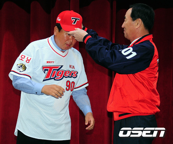 [OSEN=광주 ,백승철 인턴기자] 21일 오후 광주 KIA 제1공장 강당에서 열린 선동렬 신임감독 취임식에서 이삼웅 사장이 선동렬 감독에게 모자를 씌워주고 있다. KIA는 지난 18일 조범현 감독 사퇴와 함께 선동렬 전 삼성 감독의 선임을 발표했다. 선동렬 신임감독은 광주 출신으로 해태에서 11년간 6차례 한국시리즈 우승을 이끈바 있다. KIA 7대 사령탑인 선동렬 신인감독은 계약금 5억원, 연봉 3억8천만원에 3년간 계약을 맺었다. / baik@osen.co.kr