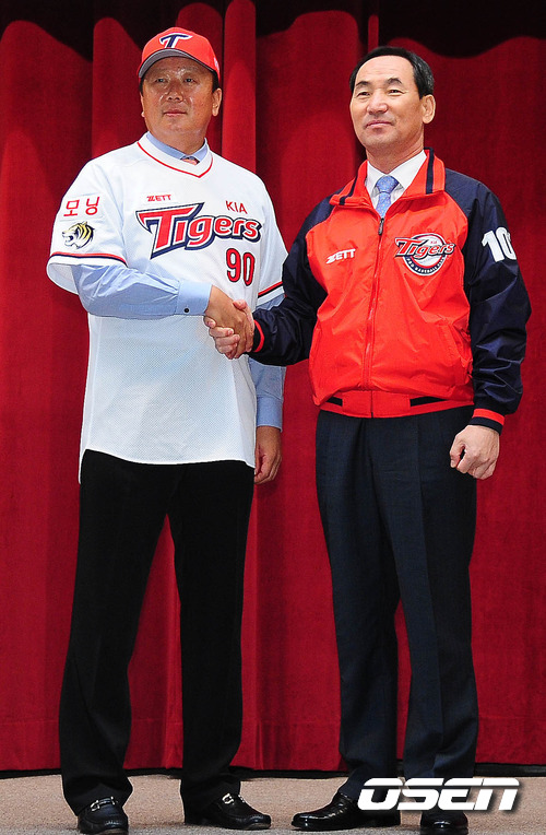 [OSEN=광주 ,백승철 인턴기자] 21일 오후 광주 KIA 제1공장 강당에서 열린 선동렬 신임감독 취임식에서 선동렬 감독과 이삼웅 사장이 기념촬영을 하고 있다. KIA는 지난 18일 조범현 감독 사퇴와 함께 선동렬 전 삼성 감독의 선임을 발표했다. 선동렬 신임감독은 광주 출신으로 해태에서 11년간 6차례 한국시리즈 우승을 이끈바 있다. KIA 7대 사령탑인 선동렬 신인감독은 계약금 5억원, 연봉 3억8천만원에 3년간 계약을 맺었다. / baik@osen.co.kr