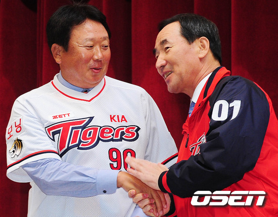 [OSEN=광주 ,백승철 인턴기자] 21일 오후 광주 KIA 제1공장 강당에서 열린 선동렬 신임감독 취임식에서 선동렬 감독이 이삼웅 사장과 악수를 나누고 있다. KIA는 지난 18일 조범현 감독 사퇴와 함께 선동렬 전 삼성 감독의 선임을 발표했다. 선동렬 신임감독은 광주 출신으로 해태에서 11년간 6차례 한국시리즈 우승을 이끈바 있다. KIA 7대 사령탑인 선동렬 신인감독은 계약금 5억원, 연봉 3억8천만원에 3년간 계약을 맺었다. / baik@osen.co.kr