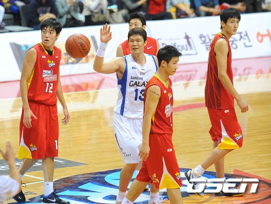KBL 최장신 피터 존 라모스(222cm)가 키 값을 하며 삼성의 연패를 끊었다. 경기 후 삼성 이규섭이 환하게 미소를 지으며 스태프에게 공을 던지고 있다. 김상준 감독이 이끄는 서울 삼성은 21일 고양체육관에서 열린 2011~2012 프로농구 고양 오리온스와 경기서 '더블-더블'을 기록한 피터 존 라모스(22득점, 11리바운드, 6도움)의 활약에 힘입어 92-76으로 승리했다. 이날 승리로 삼성은 2연패 탈출에 성공했다. 반면 오리온스는 4연패에 빠지며 첫 승 도전에 실패했다. / sunday@osen.co.kr