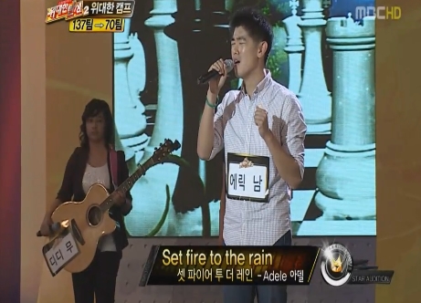 이날 에릭남은 아델의 '셋 파이어 투 더 레인(set fire to the rain)'에 이어 에코의 '행복한 나를'을 열창했다. 그는 경연에 앞서 음악을 들으며 열심히 연습했다고 포부를 밝혔다.