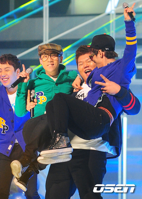 21일 밤 서울 경희대학교 평화의 전당에서 열린 Mnet ‘슈퍼스타K3’ 네 번째 생방송 무대에서 합동 무대 중 김도현이 울랄라 세션의 임윤택과 김명훈을 들어올리고 있다.
