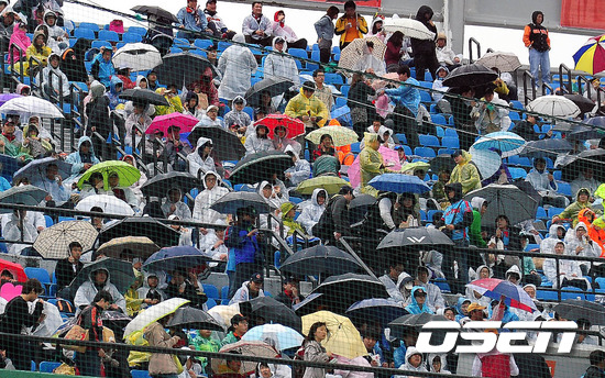 '2011 롯데카드 프로야구 플레이오프' 5차전이 벌어질 부산 사직 야구장에 비가 오는 가운데 팬들이 비옷과 우산을 쓰고 입고 경기 시작을 기다리고 있다.
