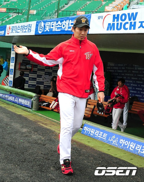 '2011 롯데카드 프로야구 플레이오프' 5차전이 벌어질 부산 사직 야구장에 비가 오는 가운데 SK 정우람이 몸을 풀기위해 외야로 나가고 있다.
