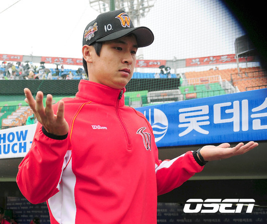 '2011 롯데카드 프로야구 플레이오프' 5차전이 벌어질 부산 사직 야구장에 비가 오는 가운데 SK 최윤석이 몸을 풀기위해 외야로 나가고 있다.