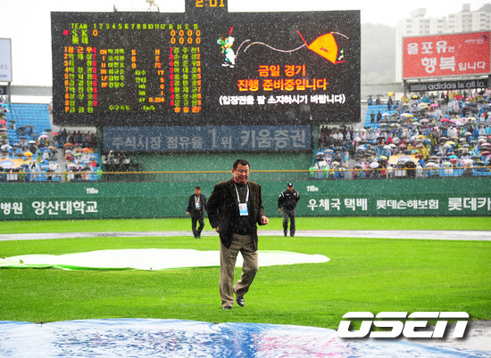 22일 롯데 자이언츠와 SK 와이번스의 플레이오프 5차전 경기가 벌어질 사직 구장에 경기 전 비가 내리고 있다. 플레이오프 5차전 선발로 롯데는 송승준 SK는 김광현을 내세웠다