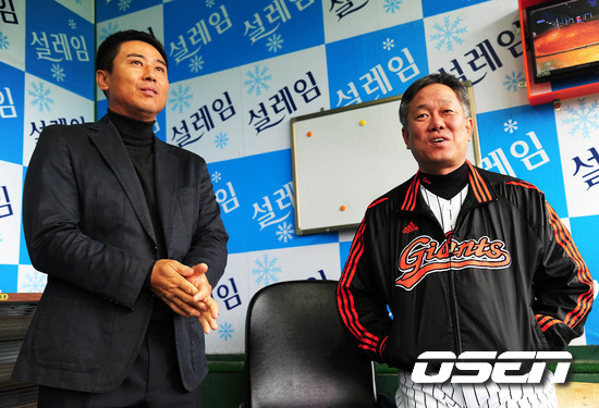 경기에 앞서 박정태 롯데 2군 감독과 양승호 감독이 이야기를 나누고 있다.