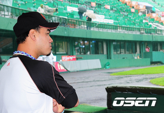 이 날 선발투수로 예정됐던 송승준이 내리는 비를 바라보고 있다.