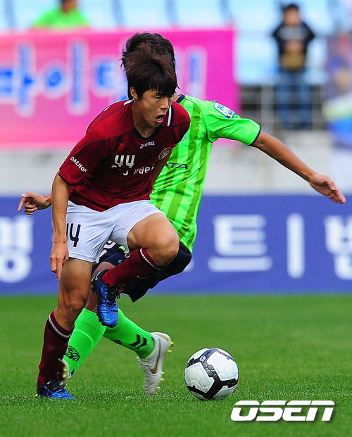 22일 오후 3시 전주 월드컵경기장에서 열린 ‘현대오일뱅크 K리그 2011’ 전북 현대와 대전 시티즌 경기에서 전반 대전 황진산이 전북 김재환에게 발을 밟히고 있다.