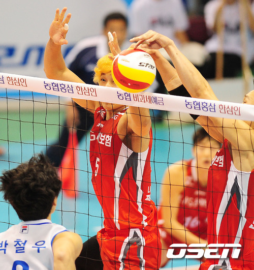 22일 오후 대전 충무실내체육관에서 열린 2011-2012 NH농협 V-리그 남자부 개막전 삼성화재와 LIG손해보험의 경기, 2세트 LIG 김요한이 삼성화재 박철우의 공격을 막아내고 있다.