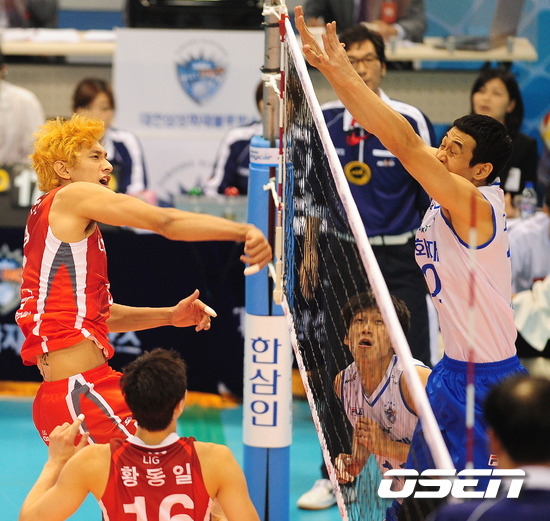 22일 오후 대전 충무실내체육관에서 열린 2011-2012 NH농협 V-리그 남자부 개막전 삼성화재와 LIG손해보험의 경기, 1세트 LIG 김요한이 삼성화재 고흐진의 블로킹을 피해 강타를 날리고 있다.