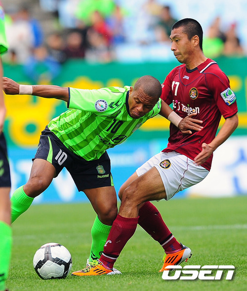 22일 오후 3시 전주 월드컵경기장에서 열린 ‘현대오일뱅크 K리그 2011’ 전북 현대와 대전 시티즌 경기에서 전반 전북 루이스와 대전 한재웅이 볼다툼을 하고 있다.