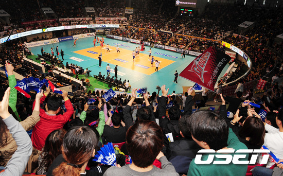 22일 오후 대전 충무실내체육관에서 열린 2011-2012 NH농협 V-리그 남자부 개막전 삼성화재와 LIG손해보험의 경기, '수많은 팬들이 경기장을 찾아 겨울스포츠의 꽃' 프로배구를 관전하고 있다.