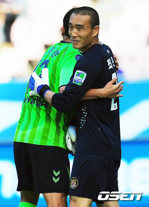 22일 오후 전주 월드컵경기장에서 열린 ‘현대오일뱅크 K리그 2011’ 전북 현대와 대전 시티즌 경기에서 전반 전북 임유환이 오프사이드 휘슬이 불때 강슛을 날린 후 대전 최은성 골키퍼와 포옹을 하고 있다.