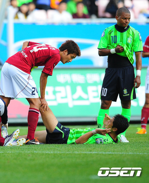 22일 오후 3시 전주 월드컵경기장에서 열린 ‘현대오일뱅크 K리그 2011’ 전북 현대와 대전 시티즌 경기에서 후반 대전 김태연이 다리에 쥐가 난 전북 정성훈의 다리를 풀어주고 있다.