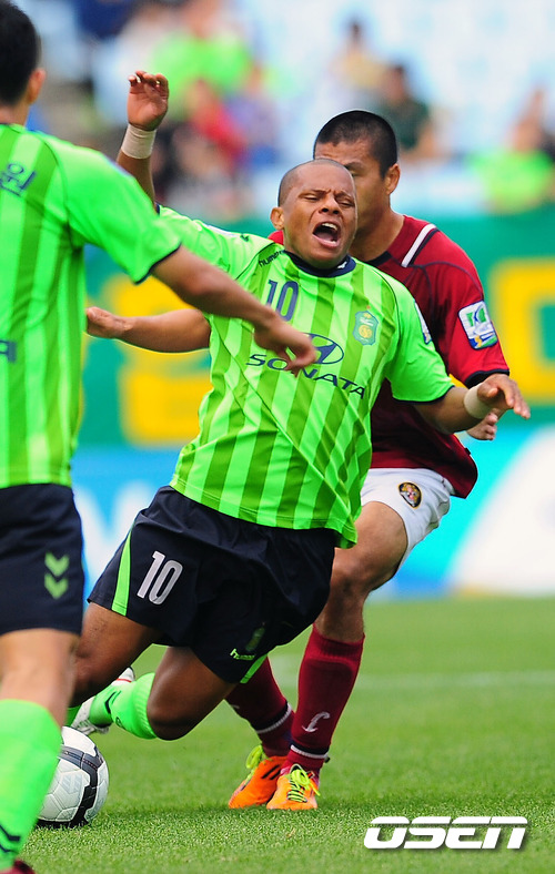22일 오후 전주 월드컵경기장에서 열린 ‘현대오일뱅크 K리그 2011’ 전북 현대와 대전 시티즌 경기에서 전반 전북 루이스가 대전 한재웅이 볼다툼중 넘어지고 있다.