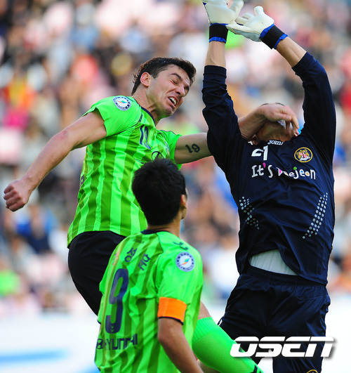 22일 오후 3시 전주 월드컵경기장에서 열린 ‘현대오일뱅크 K리그 2011’ 전북 현대와 대전 시티즌 경기에서 후반 대전 문전에서 전북 로브렉이 크로스를 헤딩슛으로 연결할려 할때 대전 최은성 골키퍼의 얼굴을 치고 있다.