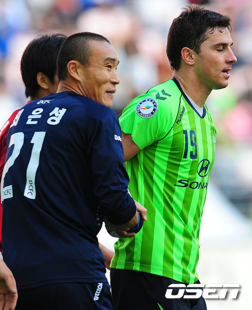 22일 오후 3시 전주 월드컵경기장에서 열린 ‘현대오일뱅크 K리그 2011’ 전북 현대와 대전 시티즌 경기에서 후반 대전 문전에서 전북 로브렉이 크로스를 헤딩슛으로 연결할려 할때 대전 최은성 골키퍼가 먼저 막아냈으나 공중에서 로브렉의 손과 발에 최은성이 맞았다. 로브렉과 최은성이 악수를 나누고 있다.