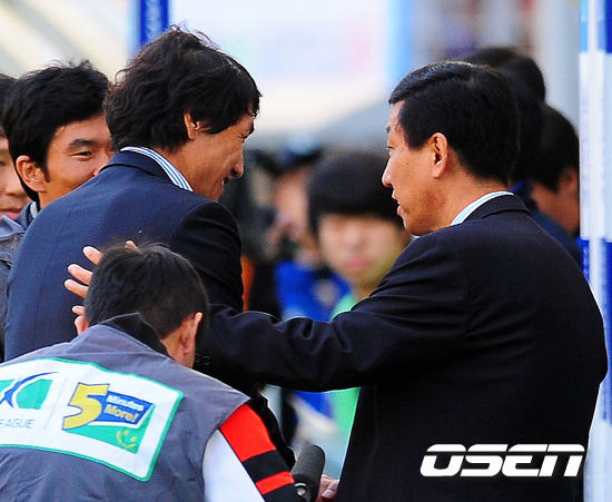 경기를 마치고 전북 최강희 감독이 대전 유상철 감독을 격려하고 있다.