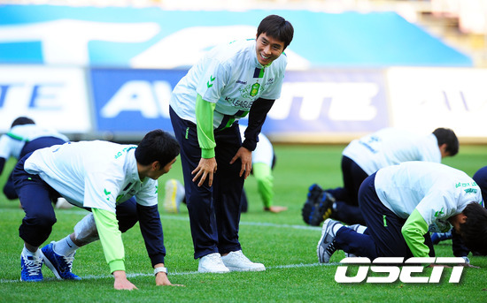 경기를 마치고 전북 이동국이 팬들에게 인사를 하려다 동료들이 모두 절을 하자 당황하고 있다.